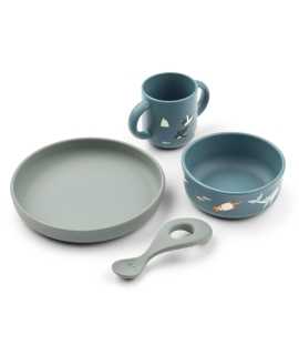 El Set de Vajilla Vivi de Liewood es la elección ideal para hacer de las comidas un momento cómodo y divertido para los más pequeños. Fabricado en silicona alimentaria de alta calidad, este set incluye un plato, un bol, una taza con asas y una cucharita, todos diseñados para fomentar la autonomía de los niños mientras comen. Su diseño elegante en el tono Artic Sea aporta un toque moderno y funcional a cualquier mesa, mientras que su durabilidad y resistencia lo convierten en una opción perfecta para el uso diario.