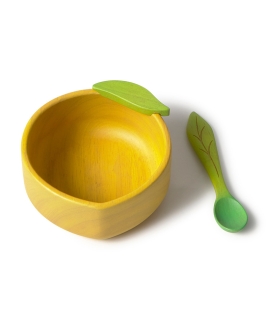 El interior del bol se presenta sin recubrimientos, mostrando la textura real de la madera. La cuchara, ligera y ergonómica, está pensada para manos pequeñas que empiezan a practicar la autonomía en la mesa. Un set simple, bien diseñado y alineado con familias que priorizan materiales puros y entornos saludables.