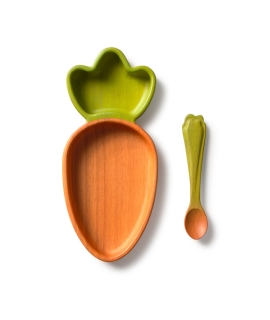 El interior del plato se presenta sin recubrimientos, mostrando la textura real de la madera. La cuchara, ligera y ergonómica, está pensada para manos pequeñas que empiezan a practicar la autonomía en la mesa. Un set simple, bien diseñado y alineado con familias que priorizan materiales puros y entornos saludables.