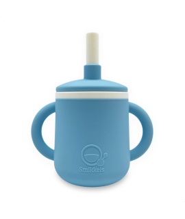 Esta taza de silicona de Smikkels está diseñada para facilitar la transición del pecho o el biberón al vaso. Tiene dos asas amplias y fáciles de agarrar y tiene una tapa que se puede poner o quitar. Además, la tapa se puede utilizar con o sin pajita.