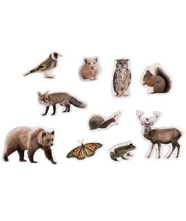 Incluye: ciervo, caracol, oso, pájaro, ardilla, rana, ratón, búho, zorro y mariposa.