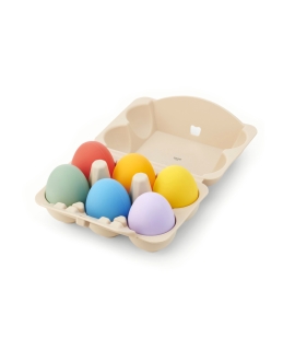 Porque combinan seguridad (silicona alimentaria), diseño pensado para manos pequeñas y aprendizajes reales: contar, clasificar, oler, escuchar y crear. El set se guarda en su huevera de silicona, listo para llevar de casa al aula y viceversa.
