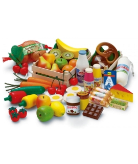 Incluye: 1 caja grande, 1 caja pequeña, 2 manzanas amarillo, 2 manzanas verdes, 2 peras verde, 2 pares de cerezas, 2 naranjas, 1 limón, 1 plátano, 2 medios kiwis, 1 manojo de rábanos, 1 pepino, 1 red de 3 patatas, 2 zanahorias, 3 tomates pequeños, 1 pimiento amarillo, 1 pimiento rojo, 1 botella de leche, 2 bebidas de yogur, 1 mantequilla, 1 salami, 1 pasta para salchichas, 1 queso edam, 3 medios huevos, 1 sal, 2 panecillos, 1 pretzel, 1 crema de chocolate Erzella, 1 miel, 1 mini chocolate. Todo ello de madera natural, cuidadosamente talladas y pintadas.