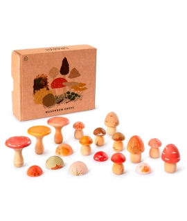 Estos hongos de madera, cuidadosamente pintados a mano, invitan al juego libre y a la creación de mini mundos llenos de fantasía. Su variedad de formas y tamaños despierta la curiosidad natural y anima a los niños y niñas a explorar, clasificar, organizar y crear sus propias historias.
