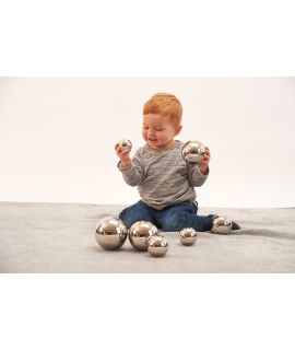 Podrán agitarlas, hacerlas rodar, observar su reflejo, y algunas podrán cogerlas con una mano pero con otras necesitarán las dos. Su tacto frío y su superficie de espejo resultan estimulantes, un juguete sensorial perfecto para bebés.