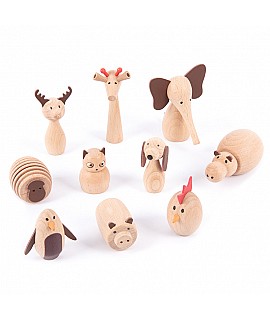 Pack de 10 mini animales de madera de haya maciza. Una selección de animales de todo el mundo, con detalles de color que los hacen encantadores.