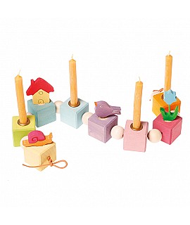 Este set está compuesto por 8 cubos de madera maciza de 4,5 x 4,5 cm agujereados, donde podemos colocar las distintas figuras o velas. Además, se incluyen 8 cuentas de madera y un cordón de cuero.