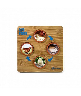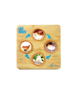 Conjunto de 40 piezas y tablero de madera de bambú, que muestra el ciclo de la vida de 10 seres vivos, tanto animales como vegetales.