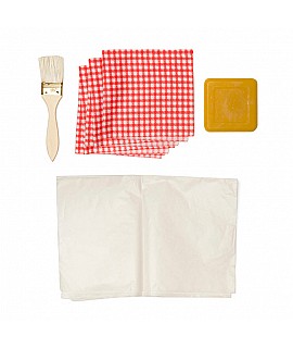 Esta caja de manualidades incluye: 3 telas de algodón de 30 x 30 cm, papel pergamino, una pastilla de cera de abeja y un pincel de madera.