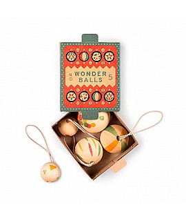 La caja Nº5 contiene 5 figuras pintadas a mano con forma de esfera (incluye hilo para colgar).