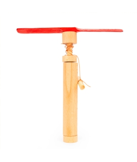 Fabricada con madera de haya certificada FSC, bambú y cuerda de poliéster, esta hélice voladora se activa al enrollarla en el lanzador y tirar con fuerza: el rotor gira rápidamente y se eleva al aire, creando un momento de asombro y diversión.